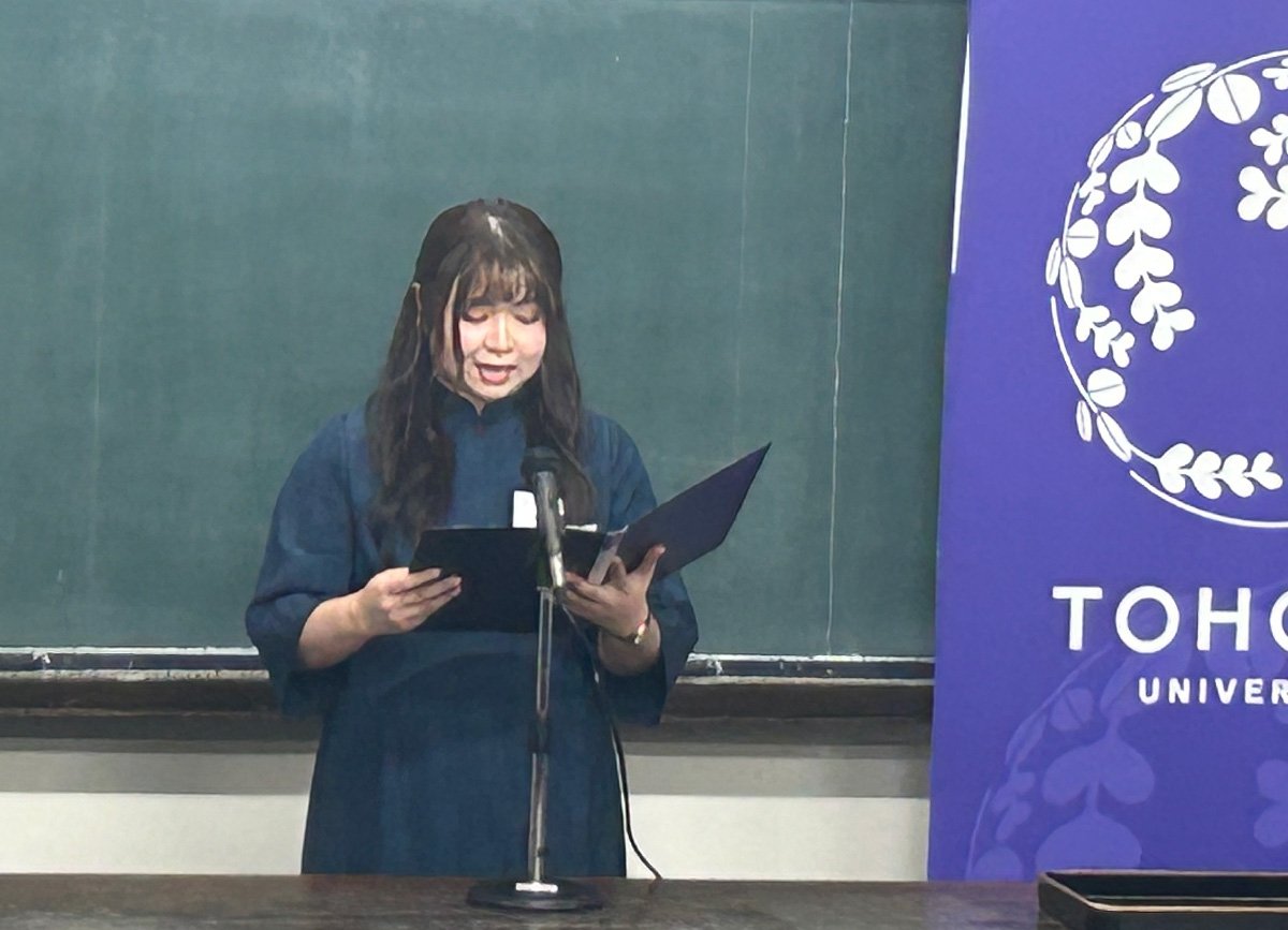 冨永悌二総長からは、本学における魯迅先生を介した日中友好の絆が紹介され、「受賞者の皆さんは世界に羽ばたき貢献し、そして架け橋となって両国の明るい未来を築いていって欲しい」との激励の言葉があり、受賞者代表からは、指導教員への御礼とともに、「魯迅先生が藤野先生から学んだ知を中国の若者へ伝えたように、自分もここで培った精神と研究姿勢を次世代の学生へ継承していきたい」との抱負が述べられました。