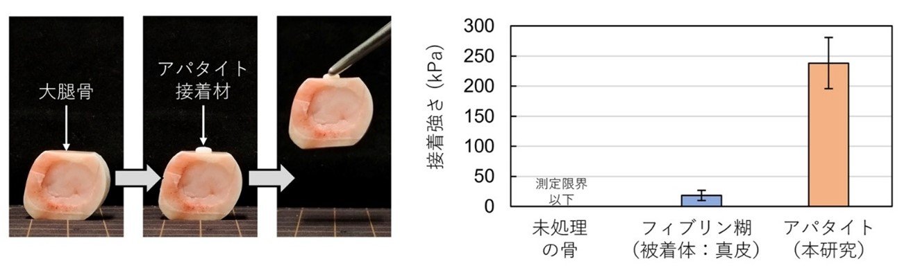 - 開発したセラミック接着材は、骨ミネラルと同じ成分で「固体状のもの」ですが、軽く押し当てるだけで瞬時に骨の表面に接着しました。