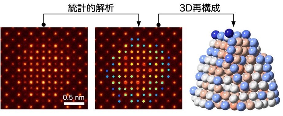 東京大学大学院工学系研究科附属総合研究機構の石川 亮 特任准教授、窪田 陸人 大学院生(研究当時)、川原 一晃 助教(研究当時、現:東北大学金属材料研究所 准教授)、二塚 俊洋 特任研究員、幾原 雄一 東京大学特別教授(兼:東北大学材料科学高等研究所(WPI-AIMR) 教授)、柴田 直哉 教授による研究グループは、新規に開発した3次元電子顕微鏡法と理論計算を用いることにより、チタン酸ストロンチウム(SrTiO3)基板に担持(注1)された白金ナノ粒子の3次元原子構造とその電子状態の解明に成功しました。SrTiO3基板に担持された白金ナノ粒子は、水分解やさまざまな化学反応を促進する不均一触媒(注2)として非常に重要な材料です。触媒活性の本質的な理解のためには、触媒反応が進行する活性サイトの原子構造と電荷分布の関係を明らかにすることが極めて重要です。本研究では、原子分解能電子顕微鏡の像強度を定量的・統計的に解析することにより、酸化物基板に担持された白金ナノ粒子の3次元原子構造および動的構造を明らかにしました。さらに、得られた実験結果に基づいた理論計算を行うことにより、配位数が小さく不安定な原子サイトに負の電荷が偏っており、そこが活性サイトであることも明らかにしました。本成果は、触媒設計に新たな指針を与え、高性能な触媒開発を加速することが期待されます。