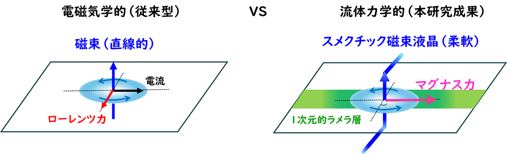 ローレンツ力駆動による磁束フロー(左)と マグナス力駆動によるスメクチック・ディスロケーション渦のダイナミクス(右)。