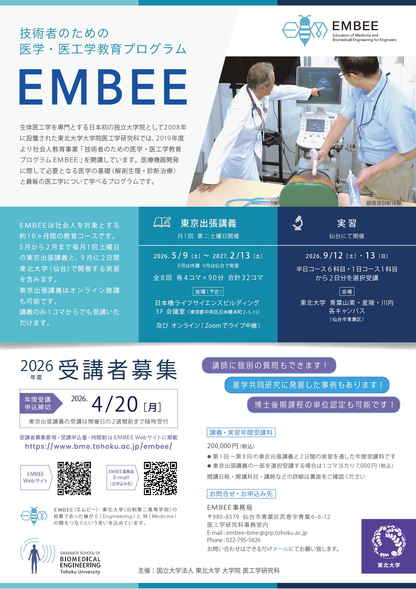 【Web,現地】技術者のための医学・医工学教育プログラム EMBEE 2026年度 第1回 東京出張講義(5.9開催)