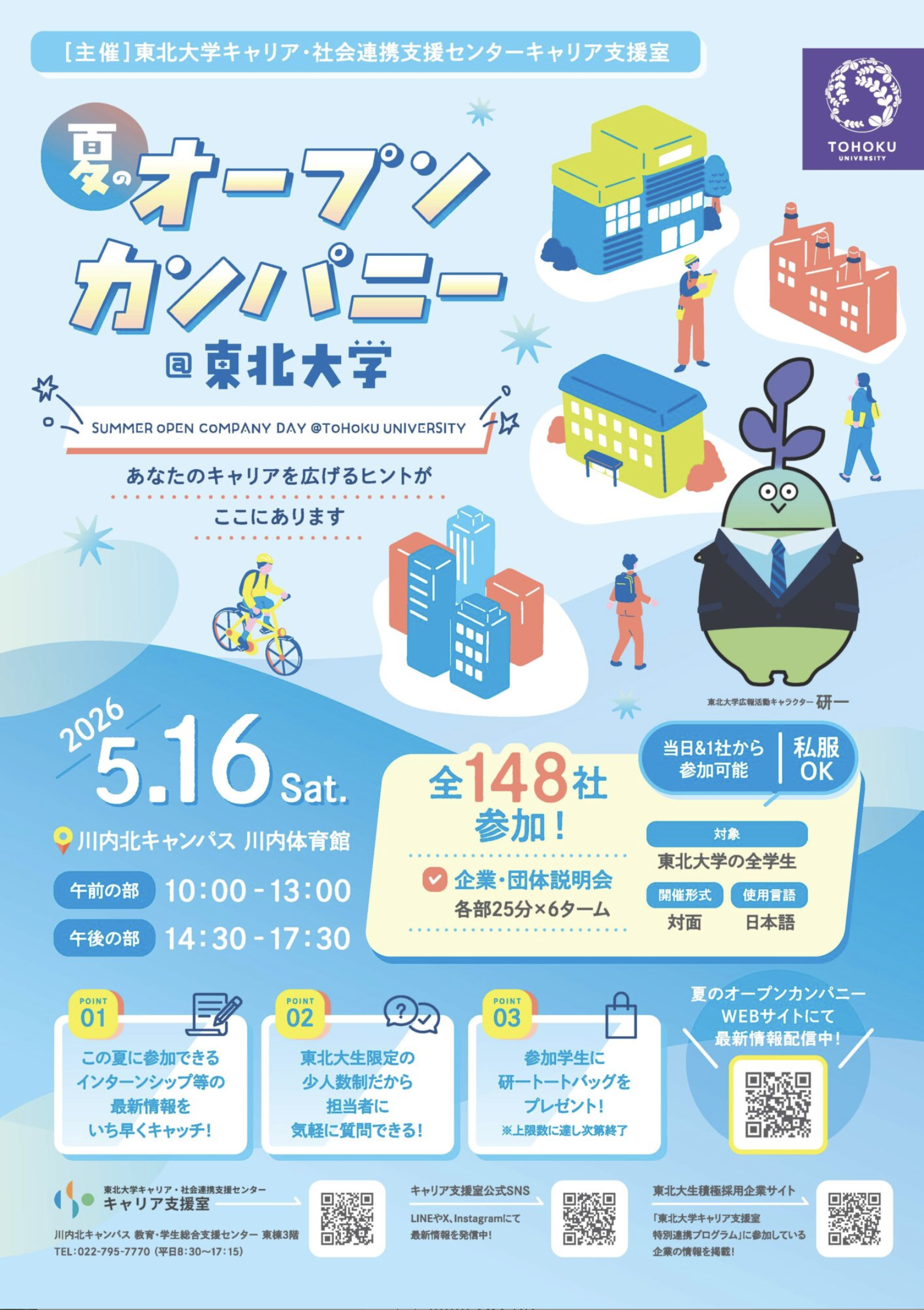 東北大生を積極採用する148社が集結する「夏のオープンカンパニー」(合同企業・団体説明会)を5/16(土)に開催いたします。川内北キャンパスの川内体育館で25分×6ターム、1日で最大12社からお話を聞くことができます。多くの企業・団体と出会えるチャンスです。ぜひご参加ください。