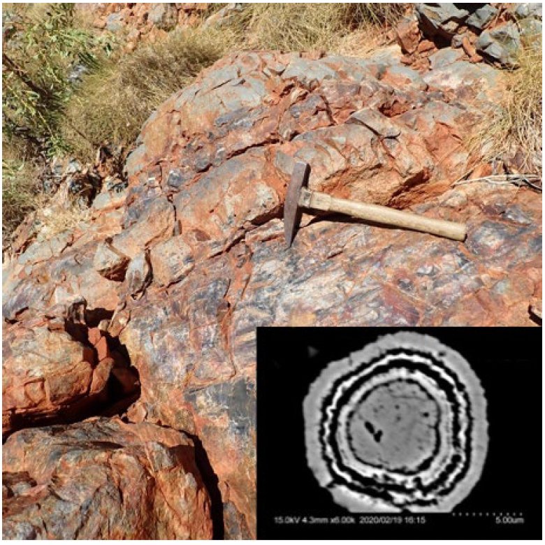 オーストラリア、約34億年前の堆積岩とその中に見つかる微小な同心円状の黄鉄鉱