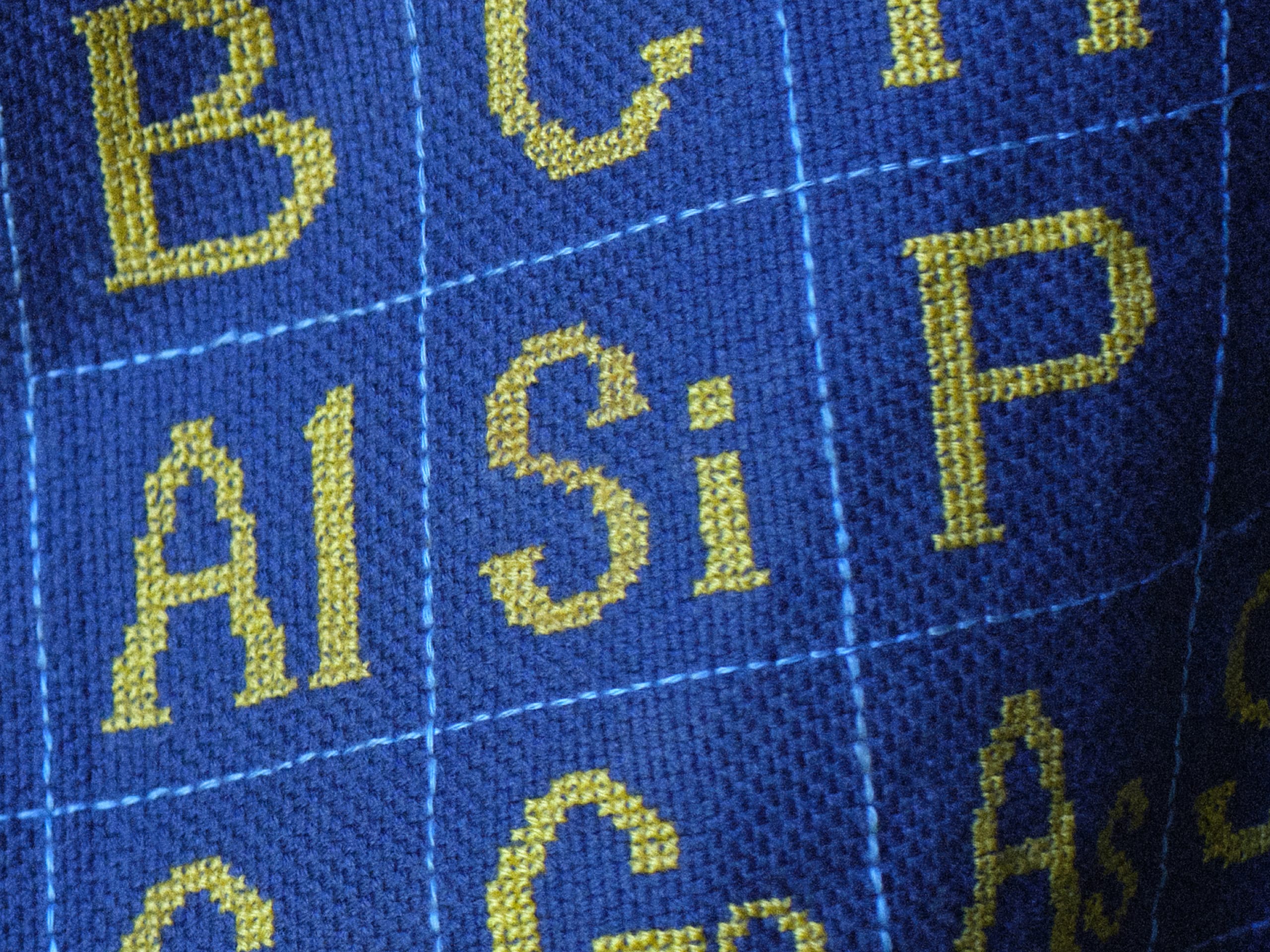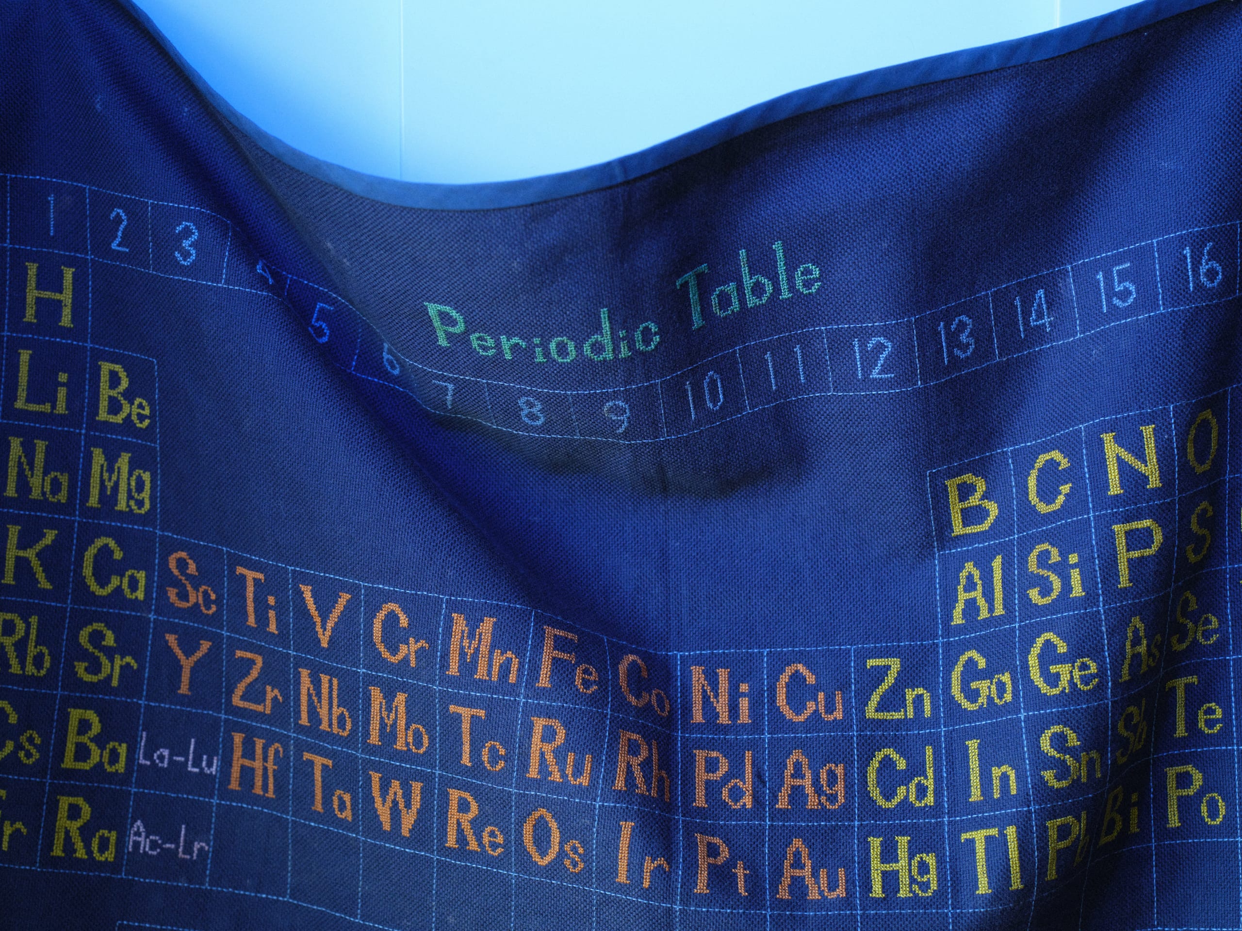 写真:妻による手作りの周期表の刺繍。元素間に新しい結合を持つ新分子材料の緻密な構造を彷彿とさせます。